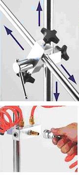 Specifications : a) The vertical bar can be adjusted from 20 cm to 210 cm high. b) The horizontal pole is 90 cm long and 2 gun supports can be rotated 360 degrees. c) The stand can be placed with 4 guns together at most. d) Net weight : 5.5 kgs |